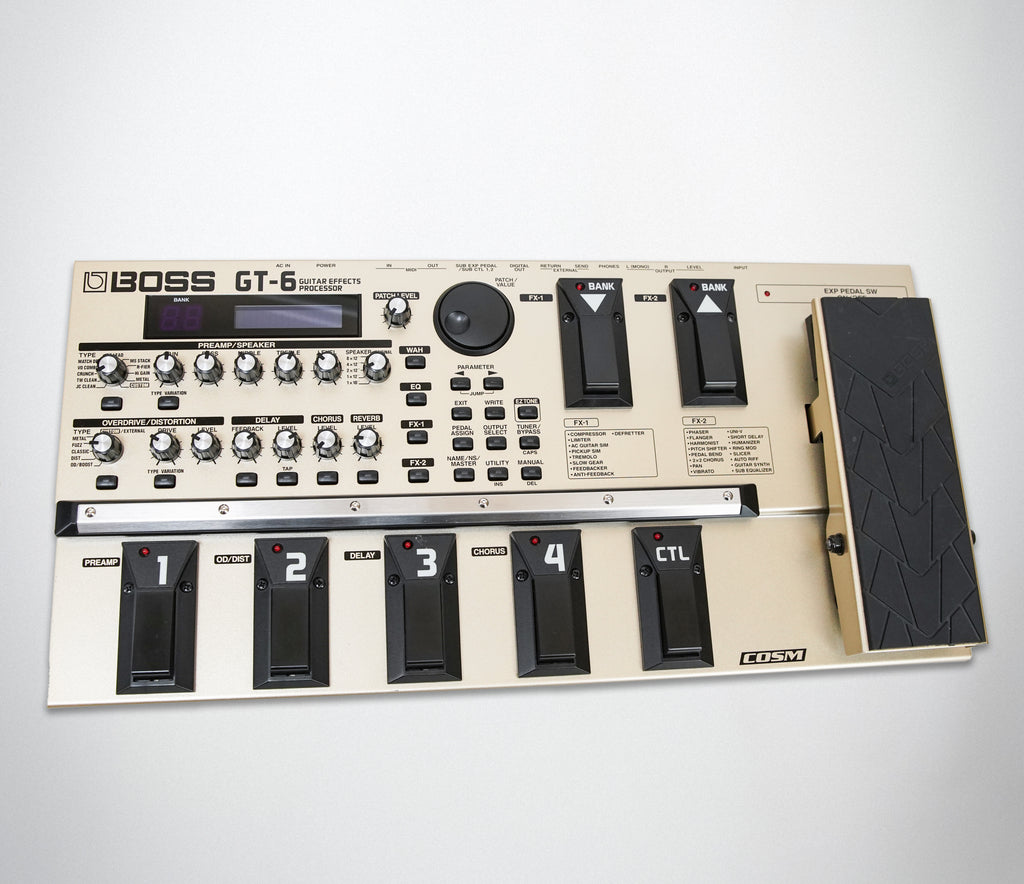 The Boss GT-6, introduced in the early 2000s, is a powerful multi-effects floorboard that quickly became a favorite among gigging guitarists. With COSM amp modeling, deep editing options, and a rugged metal chassis, it delivers a wide range of tones in a single, road-ready unit.
