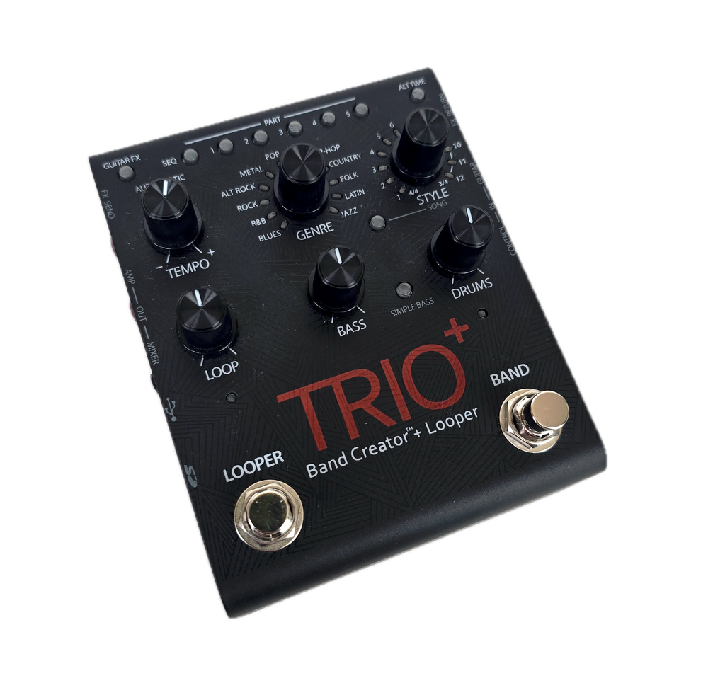 The TRIO+ is a simple-to-use guitar pedal that listens to the way you play and automatically generates bass and drum parts that match your song. Just plug your guitar into the TRIO+, press the Band footswitch to teach the TRIO+ your chords and rhythm, then press the Band footswitch again to start playing with your own personal band!