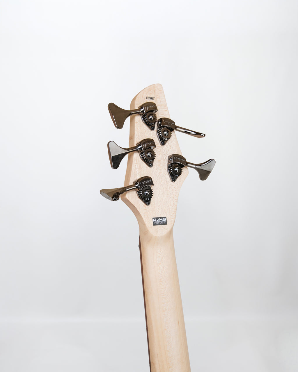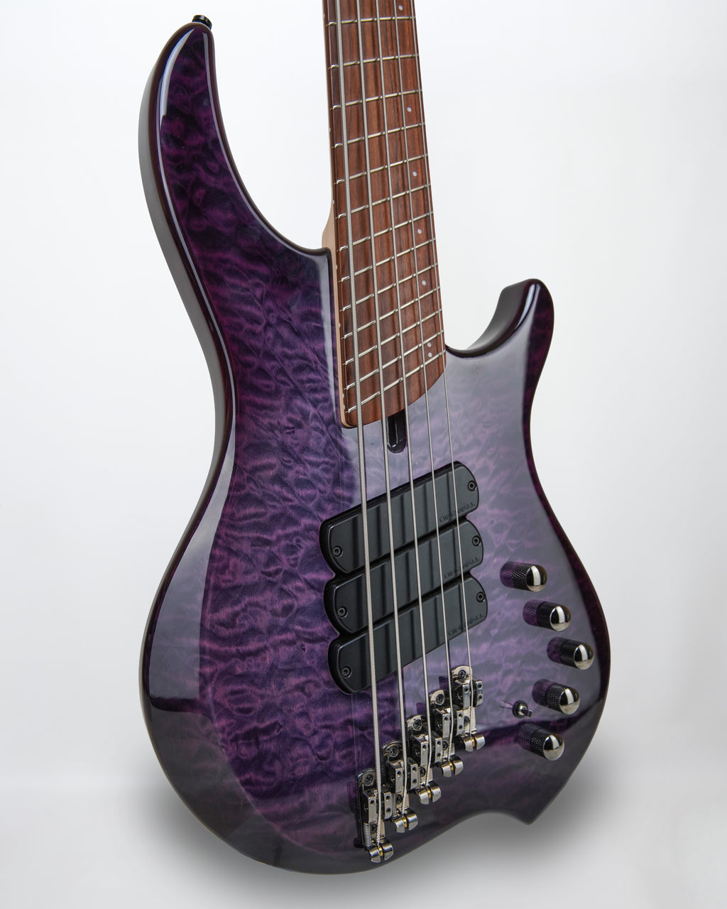 Dingwall Combustion 5 Fanned Fret 5 string bass, Swamp Ash with Quilted Maple top, five piece Maple neck, "Ultra-Violet" finish, Graphtech Black Tusq nut, 34–37-inch scale spread (the scale length of the B-string is three inches longer than the G), with a 240mm fretboard radius, Dingwall FD3n pickups, 3-band preamp, along with a 4-position Quad-tone pickup selector, master volume and an active/passive toggle switch. Gig bag included.