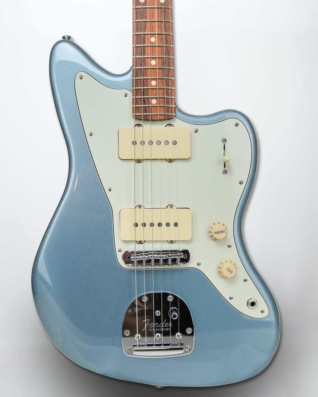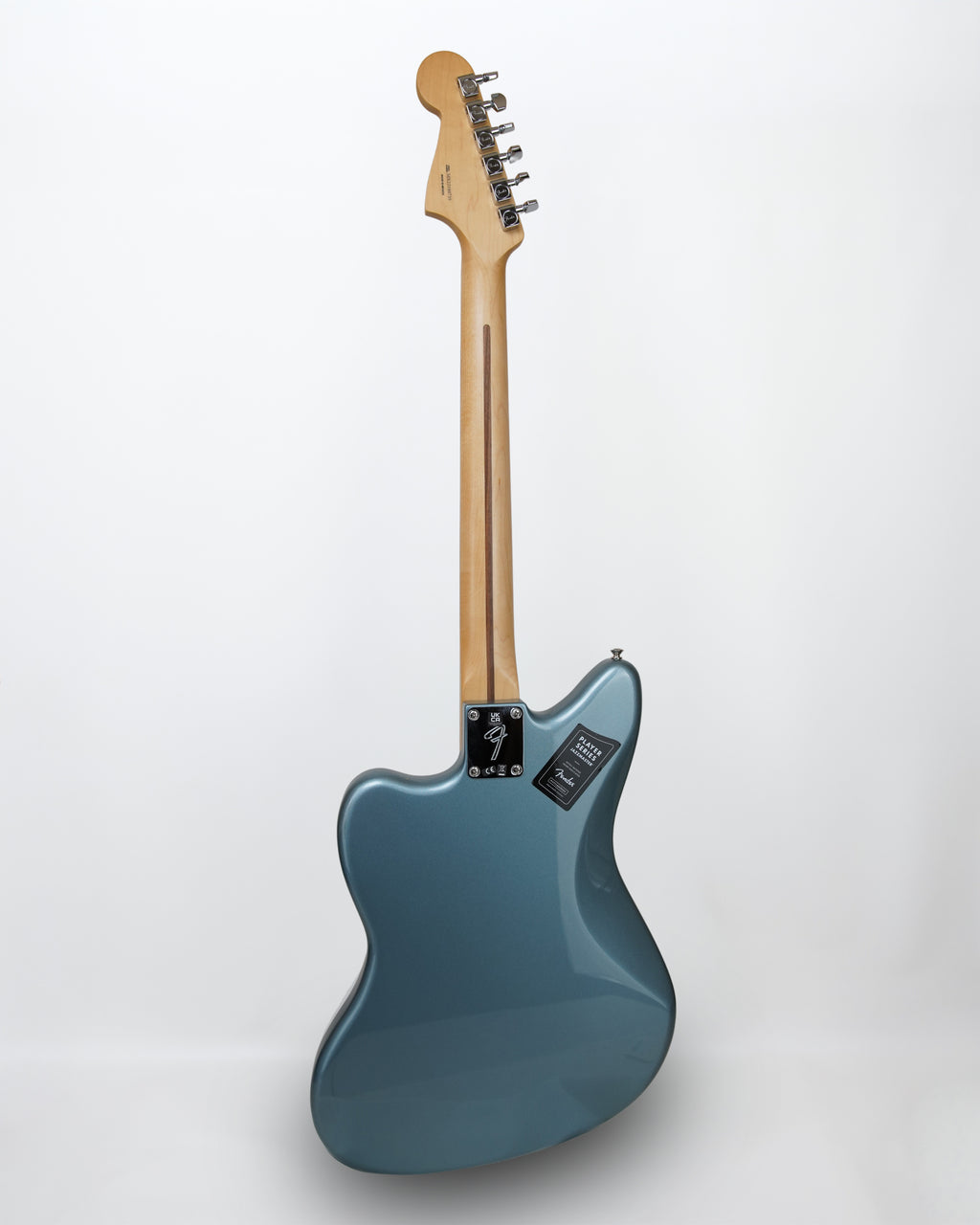 2022 Fender Player Series Jazzmaster. Alder body, modern "C" Maple neck with satin finish on back, pau ferro fingerboard, single-coil pickups, 4-way selector switch, vintage-style floating tremolo.