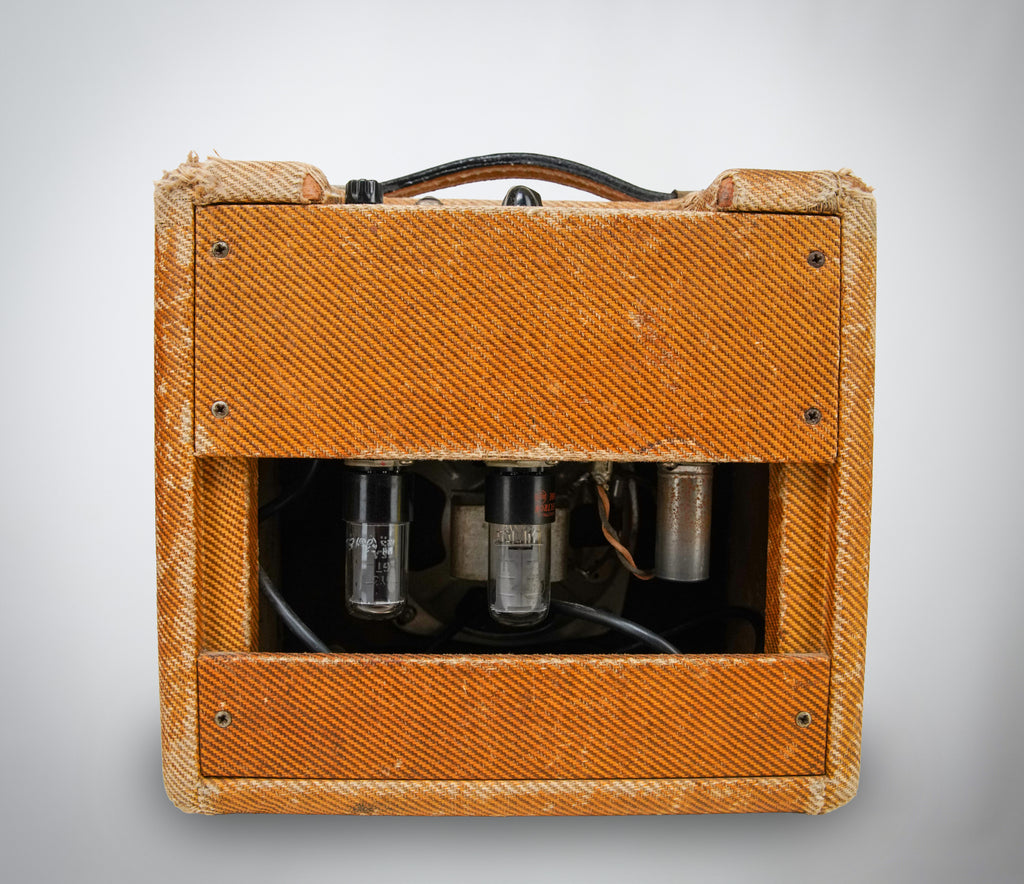 1956 Fender Tweed Champ amplifier, 6" speaker, SourSound replacement transformer, replacement leather handle, tweed covering shows wear & tear, sounds great!