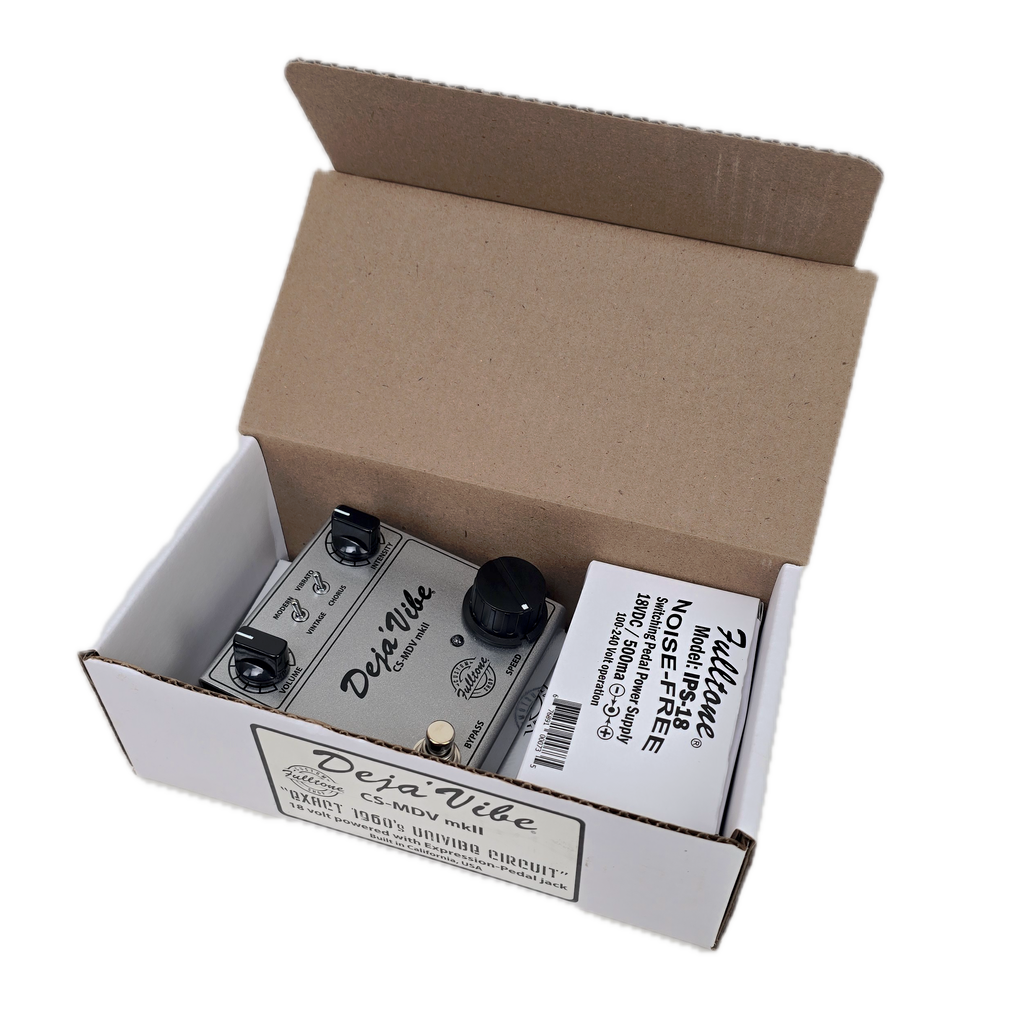 CS-MDV mkII...the world's smallest (3.9" W x 4.1" L x 2.3" H ) yet biggest sounding "real vintage Univibe clone." It's the biggest sounding 'vibe we've ever made or heard, power it with our 18 volt DC power supply (included when bought direct from us) or power it by using 2 x 9CVDC outlets on your pedalboard multi-power supply while using the Voodoo Lab PPY "series voltage doubling cable." The mkII has an expression pedal out jack should you need it, and still with no ICs and using only full-size Capacitors throughout the entire audio path.