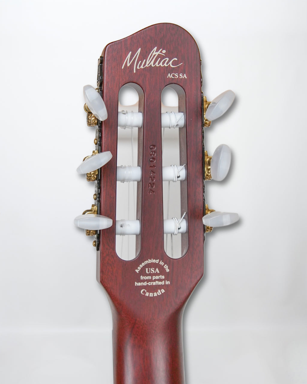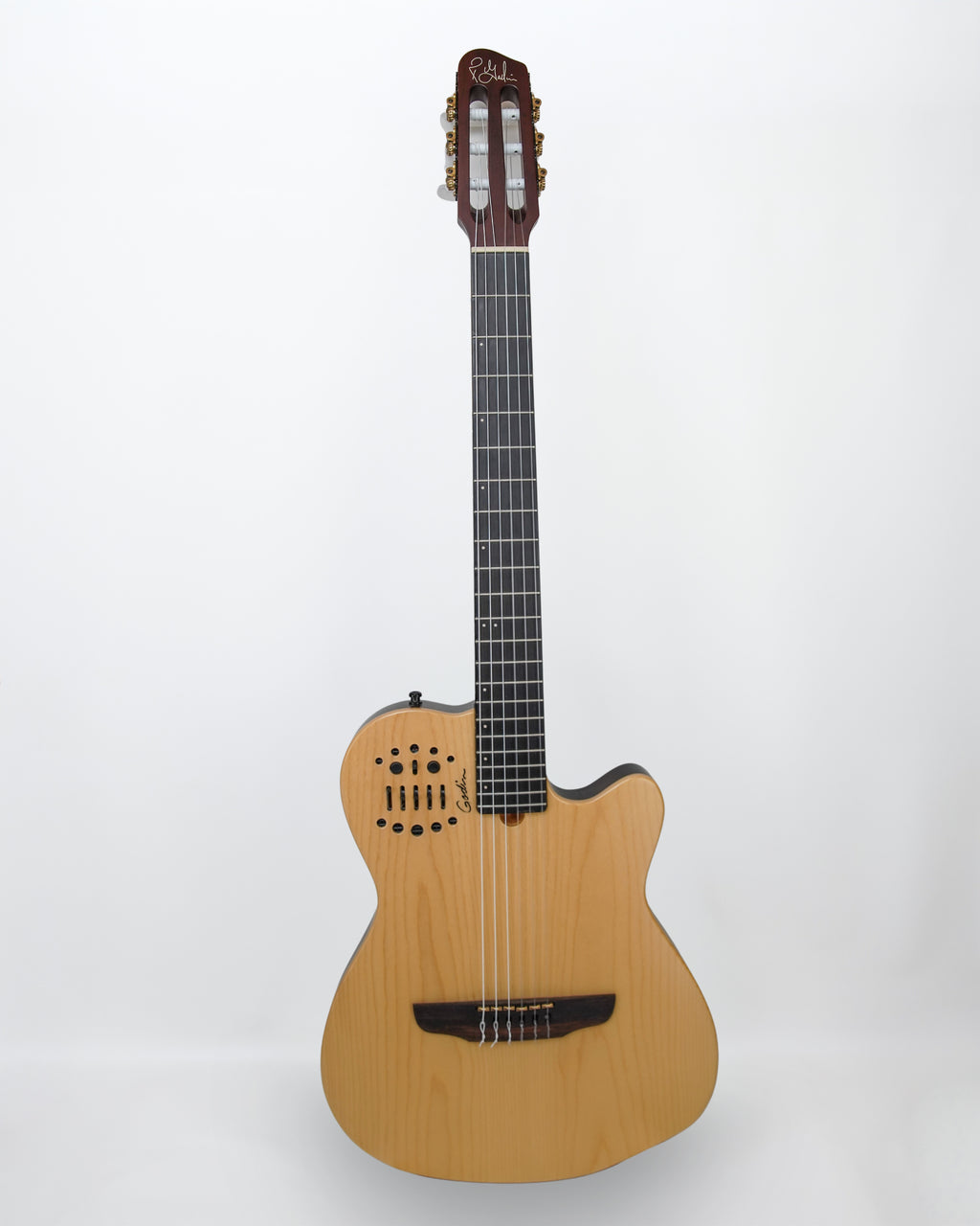 Godin ACS SA solid body nylon string guitar. Basswood capped with light Maple, Mahogany neck 1 7/8" nut width, 16" radius fingerboard, 13 pin MIDI and 1/4" outputs. Compatible with Roland guitar synths, Yamaha, and Maxon. Graphic EQ, effects, volume and tone controls. Active electronics.