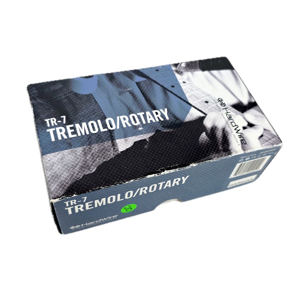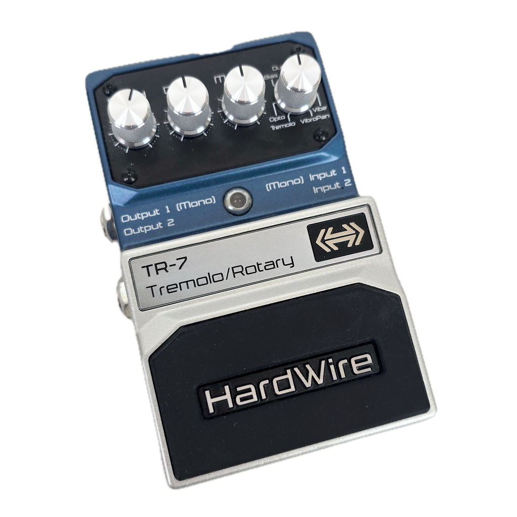 The Hardwire TR-7 is a multi-effects guitar pedal that combines tremolo and rotary speaker simulations. It features a variety of effects, including different tremolo types (Opto, Bias, Duo) and rotary sounds (Rotary Speaker, UltraVibe, Vibropan). Key features include true bypass, true stereo I/O, and high-voltage operation for superior tonal quality and noise reduction.