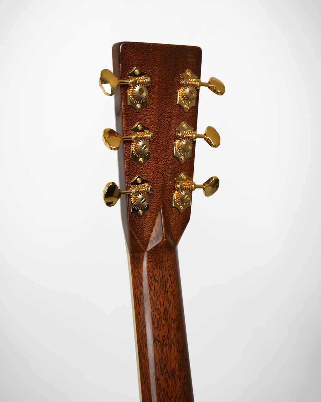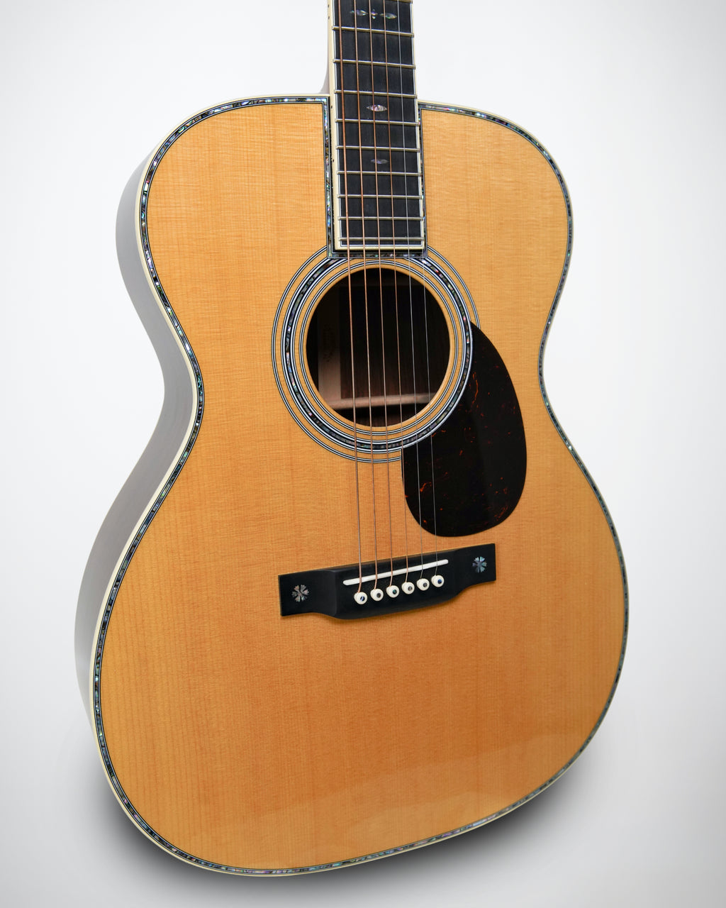 The Martin OM-42, Auditorium body size, solid Spruce top and East Indian Rosewood back and sides, 25.4" scale length, gloss mahogany neck, Golden Era Modified Low Oval profile, high performance taper. Abalone details, snowflake inlays on the bound ebony fingerboard, gorgeous rosette and pearl trim that wraps the fingerboard. Antique white binding, an ebony bridge with bone pins, and gold open gear tuners complete this stellar instrument.