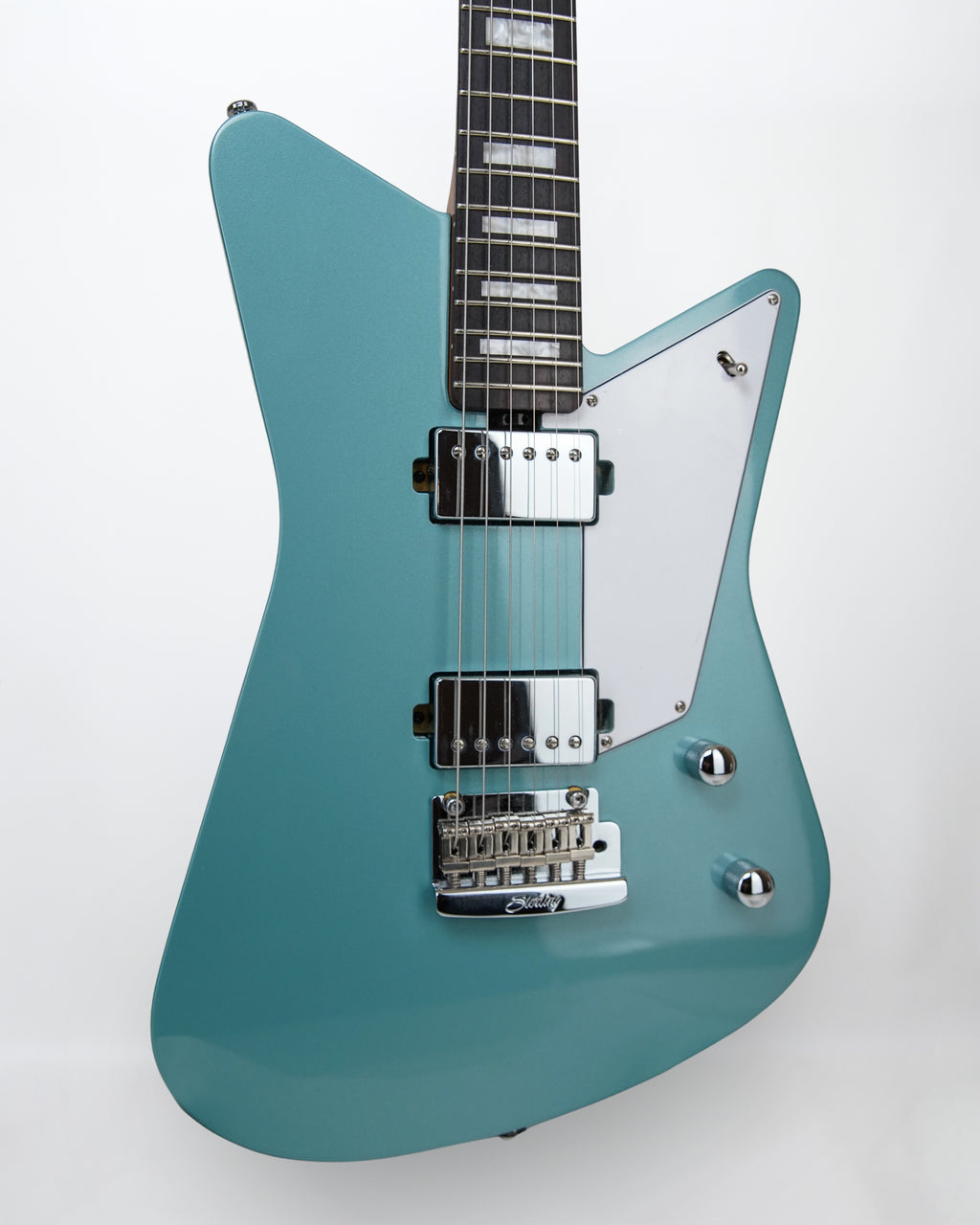 Music Man Sterling Mariposa, Daphne Blue, Nyatoh body, Roasted Maple neck, Rosewood fingerboard, White Pearloid Block Inlays fret markers, humbucker pickups with 3 way toggle control, 22 frets, 25.5" scale length, 12" neck radius, neck width is 1.65" (42mm) at Nut, 2.24" (57mm) at last fret. Includes gig bag.